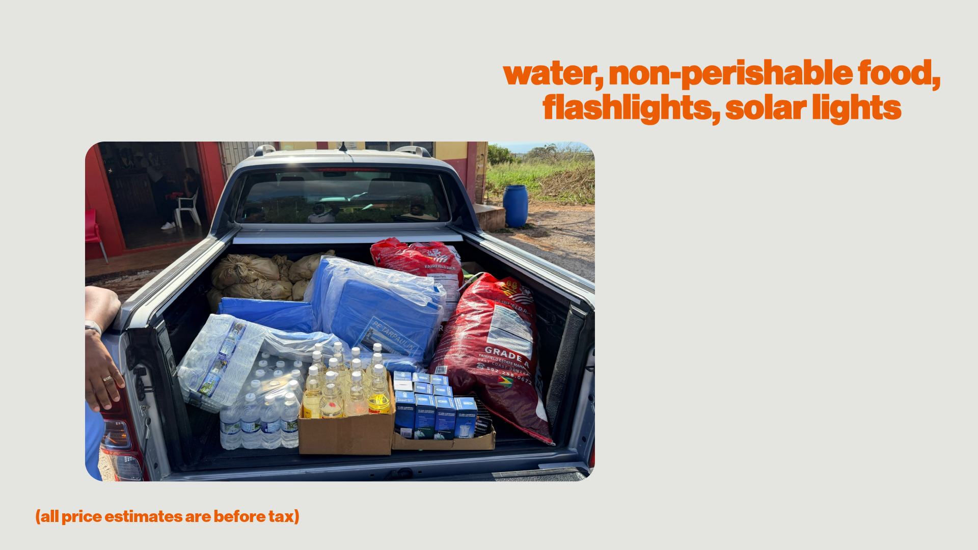 Clean water, non-perishable food, flashlights, solar lights, etc.
